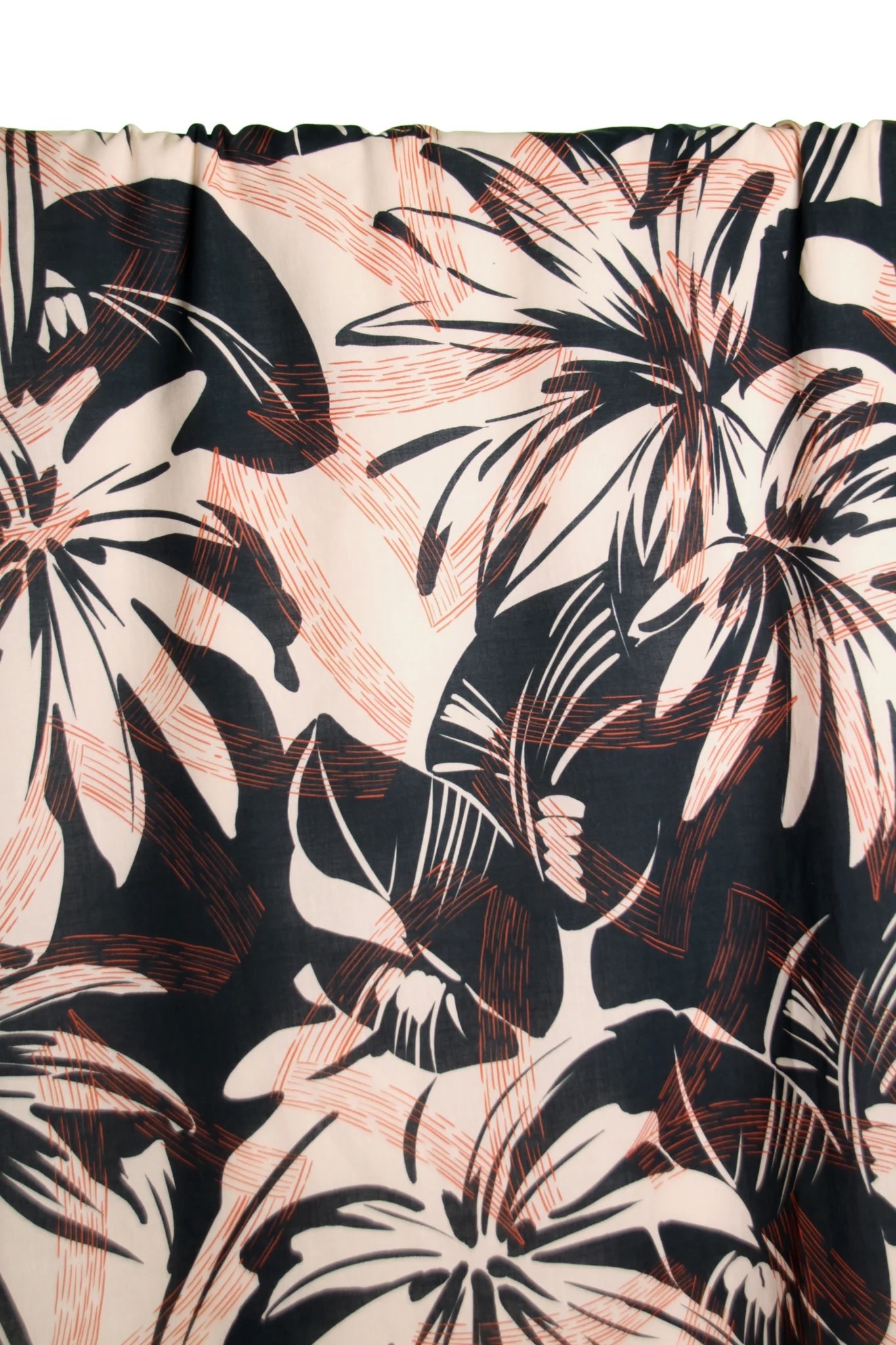 Een lichte en soepele katoen met zwarte bladeren op een beige achtergrond, afgewerkt met fijne rode lijntjes. Een subtiele print die zowel rustig als levendig oogt – ideaal voor blouses, jurken, rokken en andere luchtige creaties.